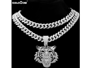 Hip Hop Iced Out Cuban Link Chains for Men Tiger Pendant Necklace Bling Crystal Cuban CZ Stainless steel Chain NecklacesOrder Now