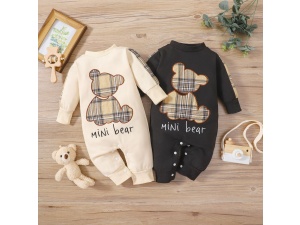 Baby clothing for baby boys Spring and autumn gingham patch bear long-sleeved open file one-piece crawling suitOrder Now