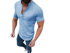 Solid color men's V-neck linen half open standing neck short sleeved shirt XX0084Order Now