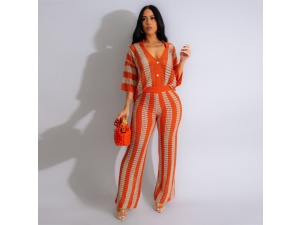 Women's Clothing sexy ladies V-neck hollow striped lapel knitted wide pants suitOrder Now