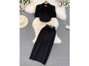 Women's Clothing light mature style, bubble short sleeves, single breasted, polka dot chiffon shirt, two piece suit