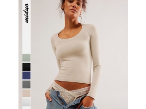 Women's Clothing nude single wear large round neck long sleeve slim fit top Y2K waist straight shoulder T-shirt female summerOrder Now
