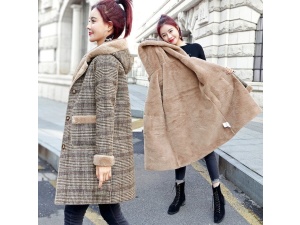 Autumn Winter Wool Coat Women Plaid Sheep Shear Leather Fur Mid Long Coats Plus Veet Thick Hooded Warm Wool Lady CoatOrder Now