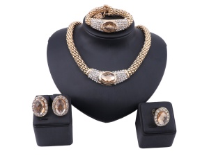 Women Gold Color Chain Choker Crystal Necklace Earring Bracelet Ring Bridal Christmas Gift Costume Jewelry SetOrder Now