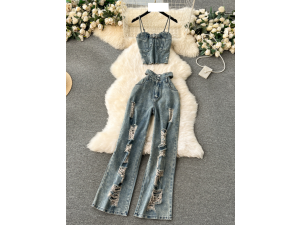 women's camisole design high waist straight wide leg pants retro denim two piece trendy setOrder Now