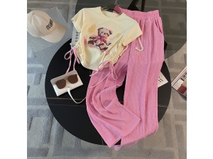 Women's new short-sleeved simple wide-leg pants suit summer pink temperament leisure medium and long fashion two-piece suitOrder Now