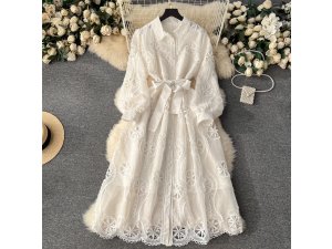 Women's Clothing Palace Style Dress For Women New Heavy Industry Embroidery Hollow Flower Breasted Slim Mid Length Puff Sleeve DressOrder Now